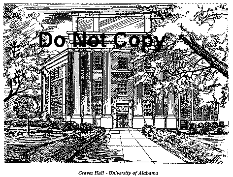 Prints of ink drawings by Jack Andrews, of fraternities, sororities, and other buildings at the University of Alabama Graves Hall.