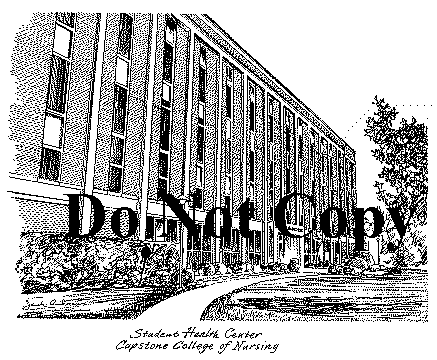 Prints of ink drawings by Jack Andrews, of fraternities, sororities, and other buildings at the University of Alabama Student Health Center.